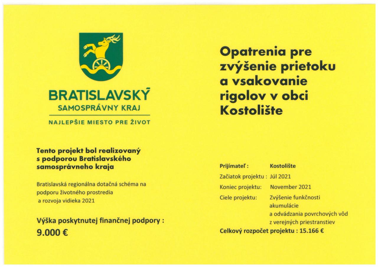 Poskytnutím dotácie vo výške 9 000,- Euro sa podarilo zrealizovať a obnoviť funkčnosť rigolov pri hlavnej ceste, zabezpečiť odvádzanie, ale aj akumuláciu dažďových vôd s odvodom do vodného toku Ježovka. Pozužitím vhodných stavebných materiálov, žľabov zatrávňovacej dlažby aa výsadbou stromov sa vytvoril systém, ktorý aj na pohľad zveľadil centrum našej obce za čo srdečne ďakujeme Bratislavskému samosprávnemu kraju.