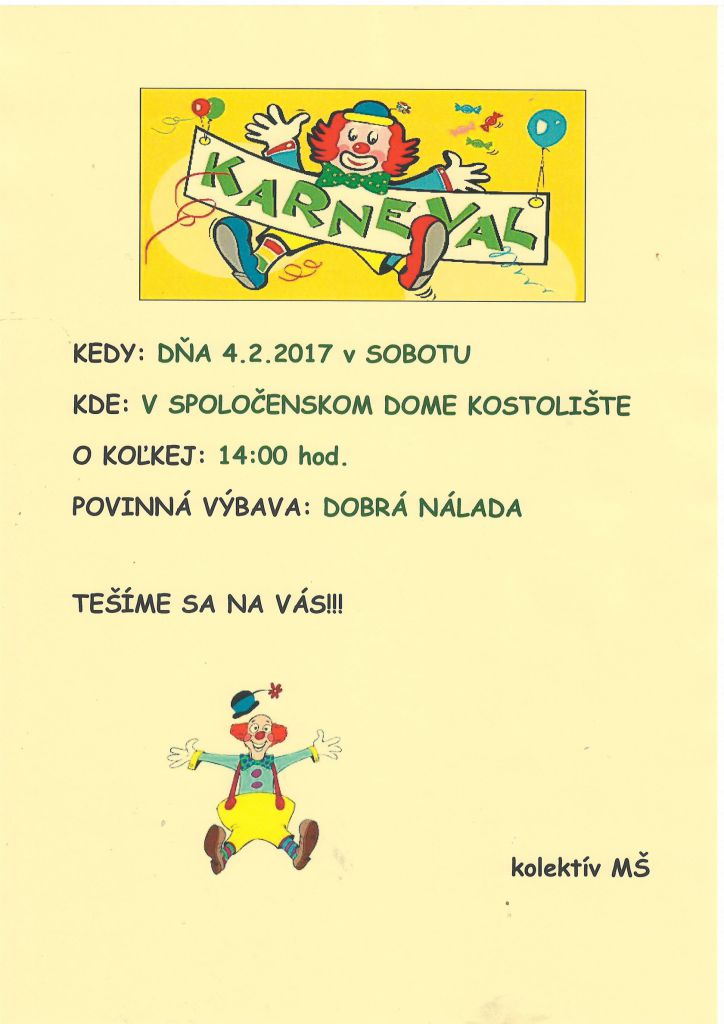 Detský karneval v Spoločenskom dome v Kostolišti dňa 4. februára 2017 o 14,00 hod.